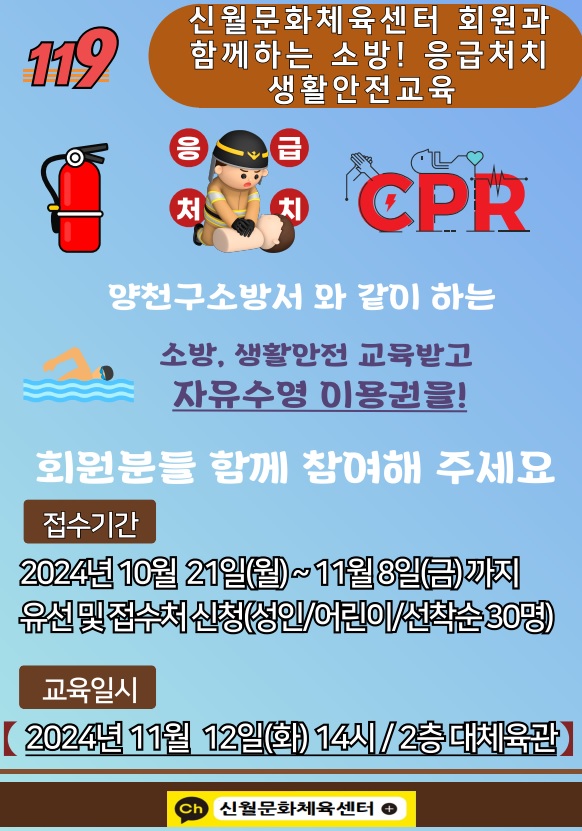 양천구시설관리공단(이사장 박태문) 신월문화체육센터에서는 회원 및 지역주민을 대상으로 오는 11월 12일(화) 14시 <회원과 함께하는 생활안전교육>을 실시한다고 밝혔다.