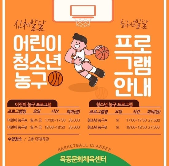 목동문화체육센터 농구 프로그램은 드리블, 패스, 슛, 리바운드뿐만 아니라 크로스오버, 스틸 등 공격과 수비 기술을 초등학생부터 청소년까지 연령별 맞춤형으로 진행하며, 어린이 농구프로그램은 월, 수, 금 17:00~17:50, 18:00~18:50, 청소년 농구프로그램은 토 17:00~17:50, 18:00~18:50 각각 두 개 반을 운영하고 있다. 더 자세한 사항은 양천구 시설관리공단 홈페이지(www.ycs.or.kr)을 통해 확인 가능하다.