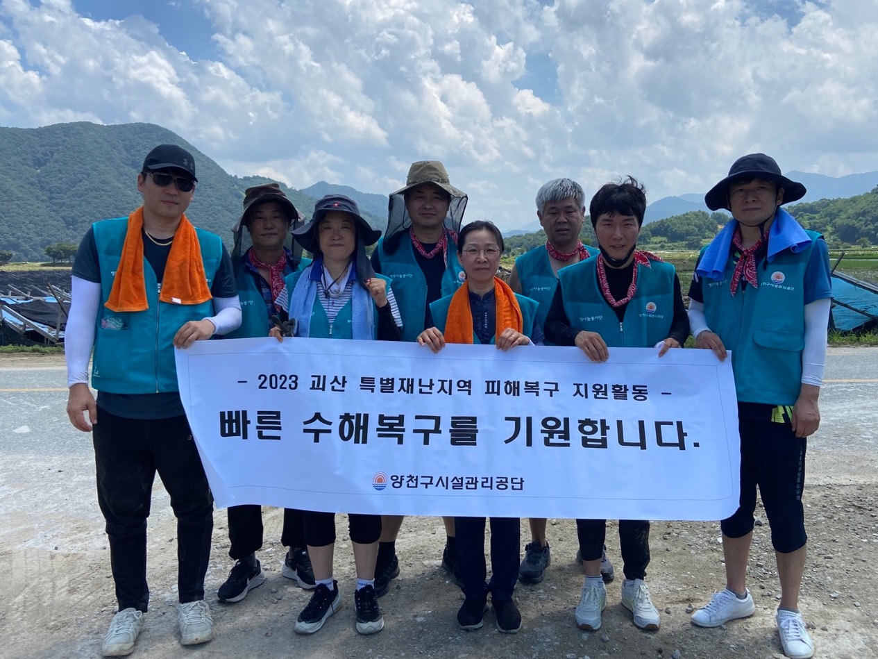 양천구시설관리공단(이사장 박태문)은 지난 28일 집중호우로 인해 피해를 입은 충청북도 괴산군을 찾아 수해복구 자원봉사 및 마스크팩 1200장을 후원했다.