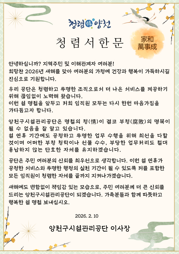 이용화 이사장은 “설 명절 기간뿐만 아니라 상시 투명하고 공정한 업무 수행을 통해 지역 주민과 이용 고객으로부터 변함없는 신뢰를 받는 기관이 되도록 최선을 다하겠다”며, “새해에도 청렴과 책임을 바탕으로 주민의 삶의 질 향상에 기여하는 최상의 공공서비스를 제공하기 위해 지속적으로 노력하겠다”고 말했다.