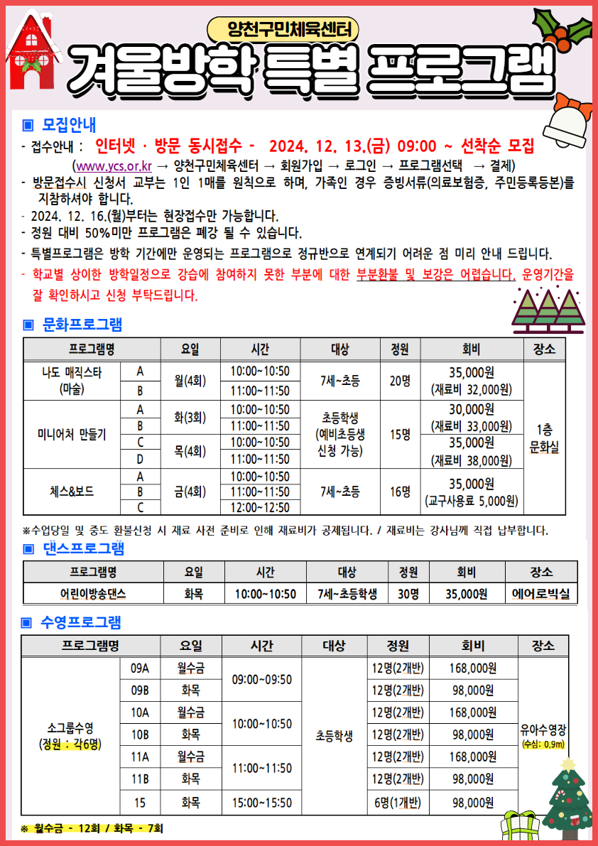 양천구민체육센터, 겨울방학 특별 프로그램 운영 안내