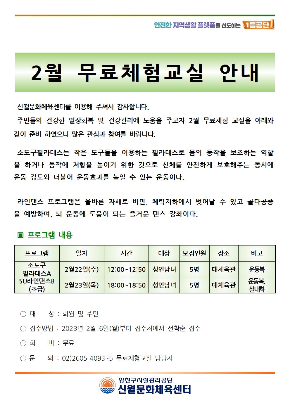 신월문화체육센터 2월 무료체험교실 안내