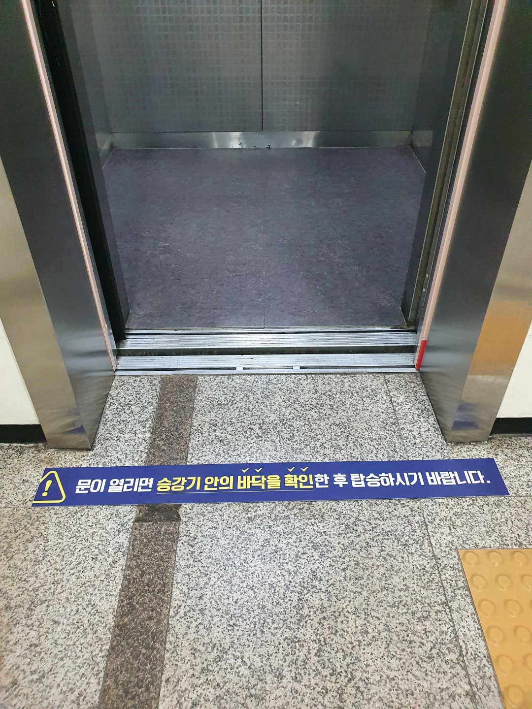 양천구시설관리공단(이사장 조주연) 양천구민체육센터는 승강기를 이용하는 주민들의 안전을 위해 승강기 앞 바닥 확인 후 탑승을 위한 안전스티커가 부착되었다. 승강기는 작은 충격이나 이물질에도 센서가 작동하여 운행이 중단되는 경우가 발생하는데, 특히 승강장 바닥과 승강기의 높이 차이로 인한 사고가 많이 발생된다. 양천센터는 이러한 승강기 사고를 사전에 방지하고자 안전기준에 따른 승강기 앞 안전 문구 표시 스티커를 부착하였다. 특히 주의를 잘 살피지 않는 어린이나 거동이 불편하신 어르신들이 조금 더 조심히 살피고 안전하게 이용할 수 있기를 바라는 마음에 지하1층부터 3층까지 센터의 모든 승강기 앞 바닥 4곳에 안전스티커를 부착하였다.