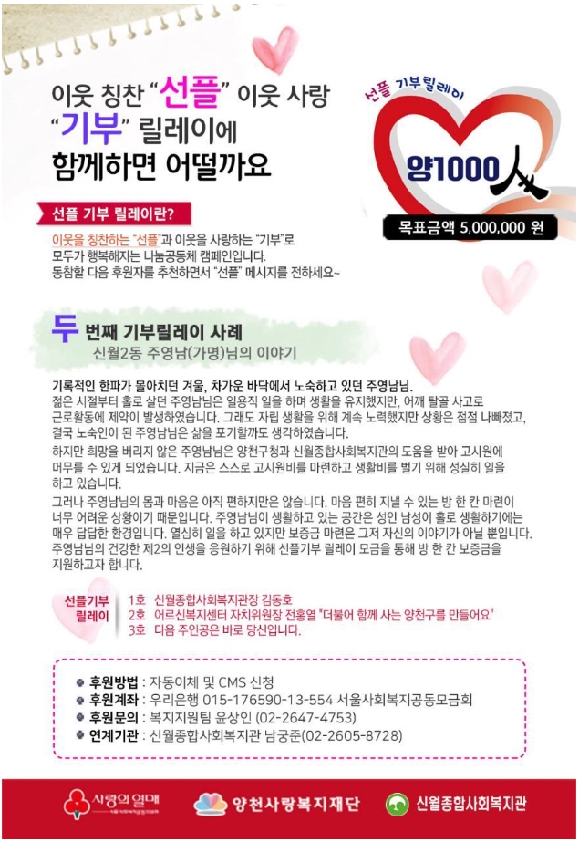 포상금은 100만원으로, 5월10일(수) 전액 양천사랑복지재단 후원계좌로 기부할 예정이다.