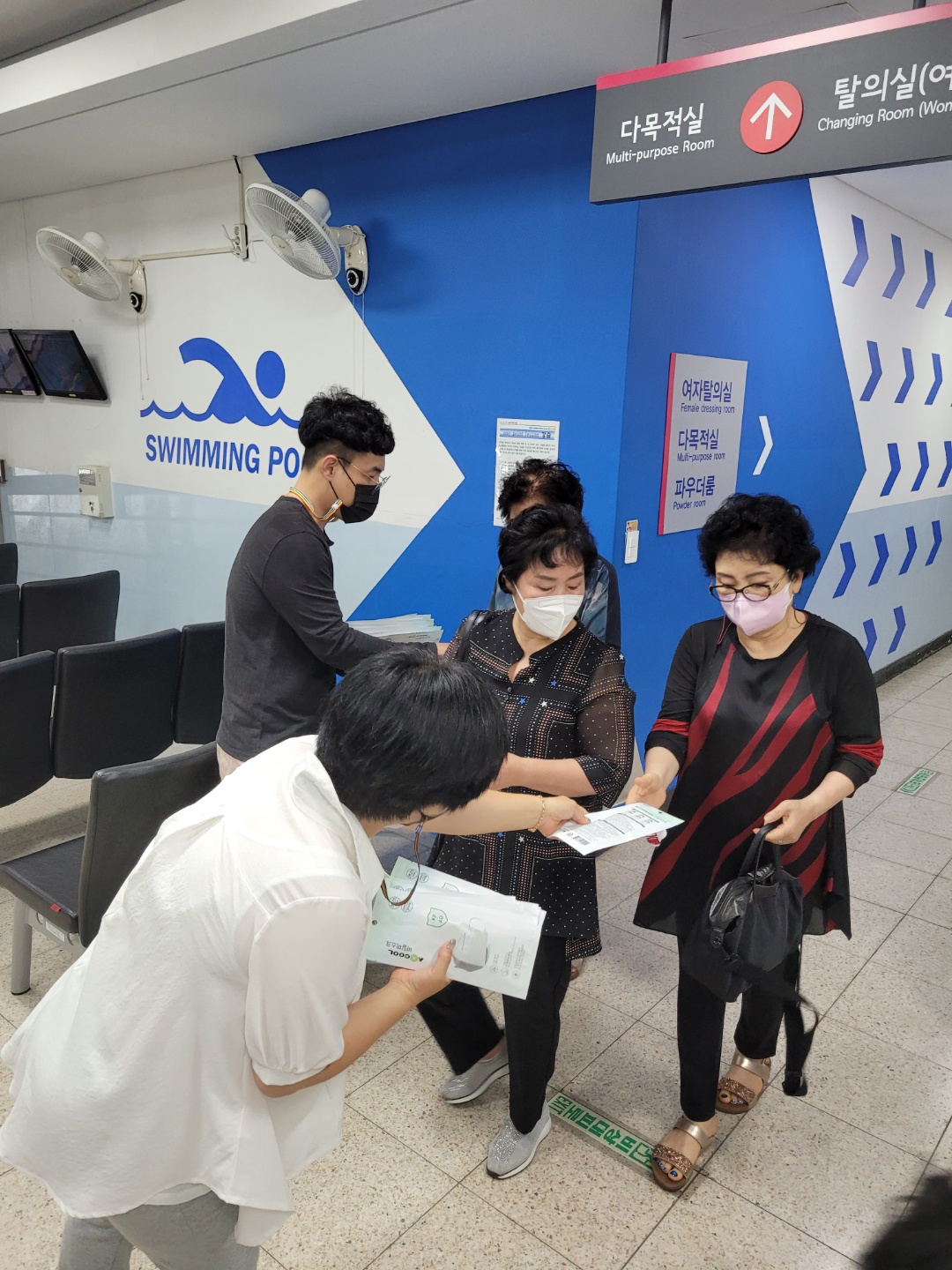 해당 캠페인은 어르신들이 많이 참여하는 오전수영 및 아쿠아로빅 이용회원을 대상으로 이루어졌으며, 7월 15일(금) 9시부터 12시까지 신월문화체육센터 지하1층에서 진행되었다.