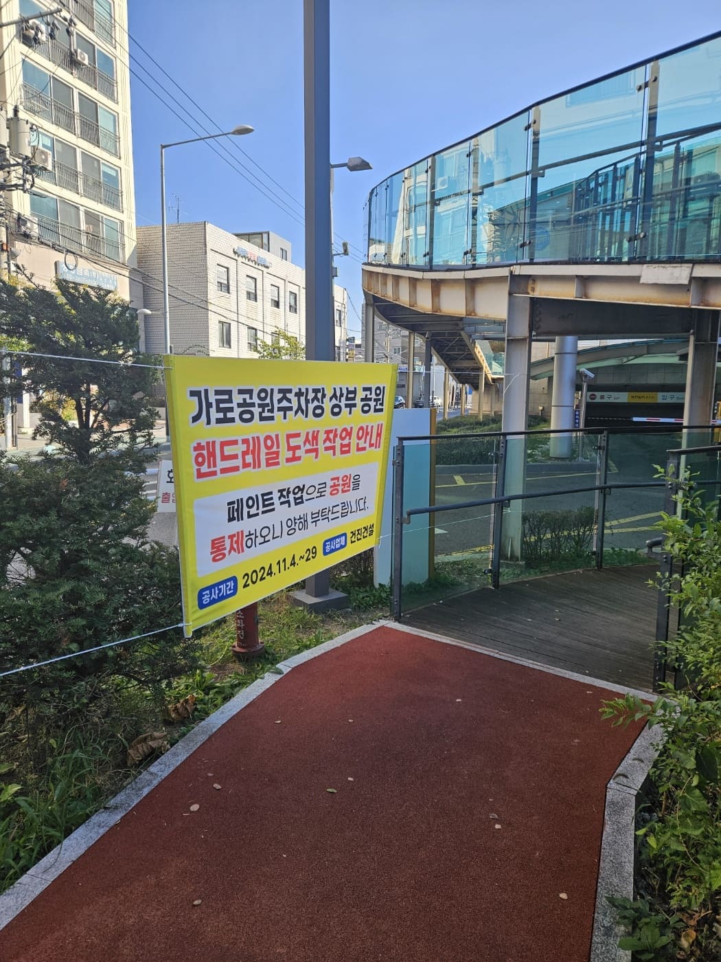 양천구시설관리공단(이사장 박태문) 주차사업팀에서는 11월 4일(월)부터 29일(금) 가로공원공영주차장(양천구 가로공원로 116-1) 상부에 설치되어 있는 스카이브릿지 핸드레일 도색공사를 실시한다고 밝혔다.