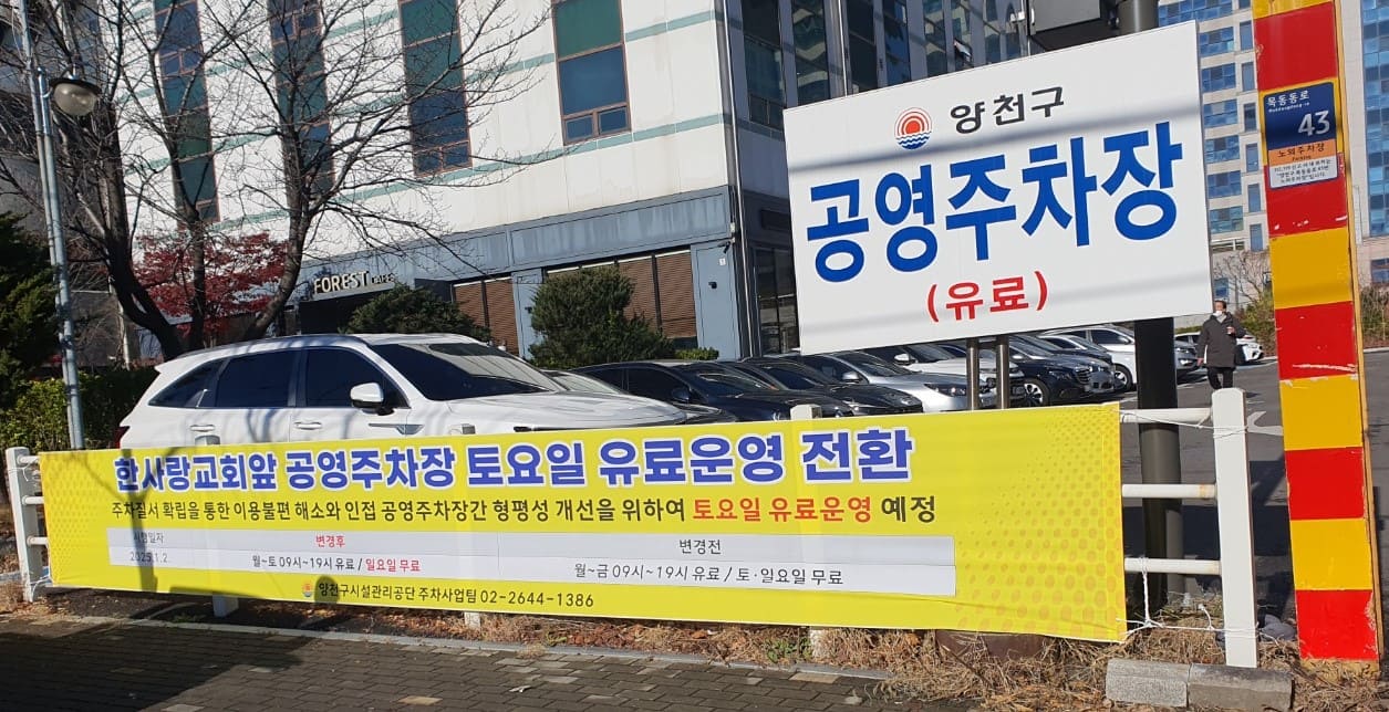 양천구시설관리공단(이사장 박태문) 주차사업팀에서는 오는 2025년 1월 2일부터 한사랑교회앞 공영주차장(양천구 신정7동 324-11)의 토요일 주차를 유료화한다고 밝혔다.