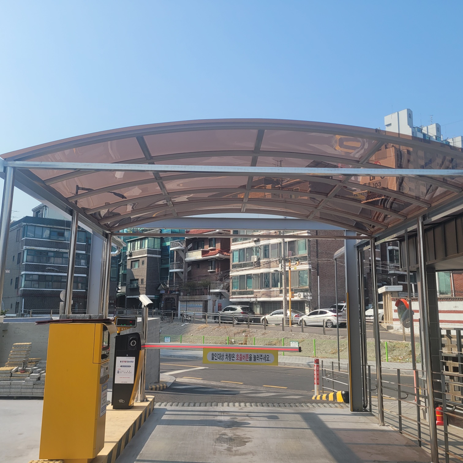 이번 옥상 캐노피 설치공사는 우천 시 외부에 노출되어있는 출구 정산기로 빗물이 유입되어 발생할 수 있는 기계오류 및 고장을 최소화하고, 외부계단 이용 시 빗물로 인한 전도사고를 사전 예방하기 위해서 차량 출구 및 북측계단실에 공사를 실시했다.
