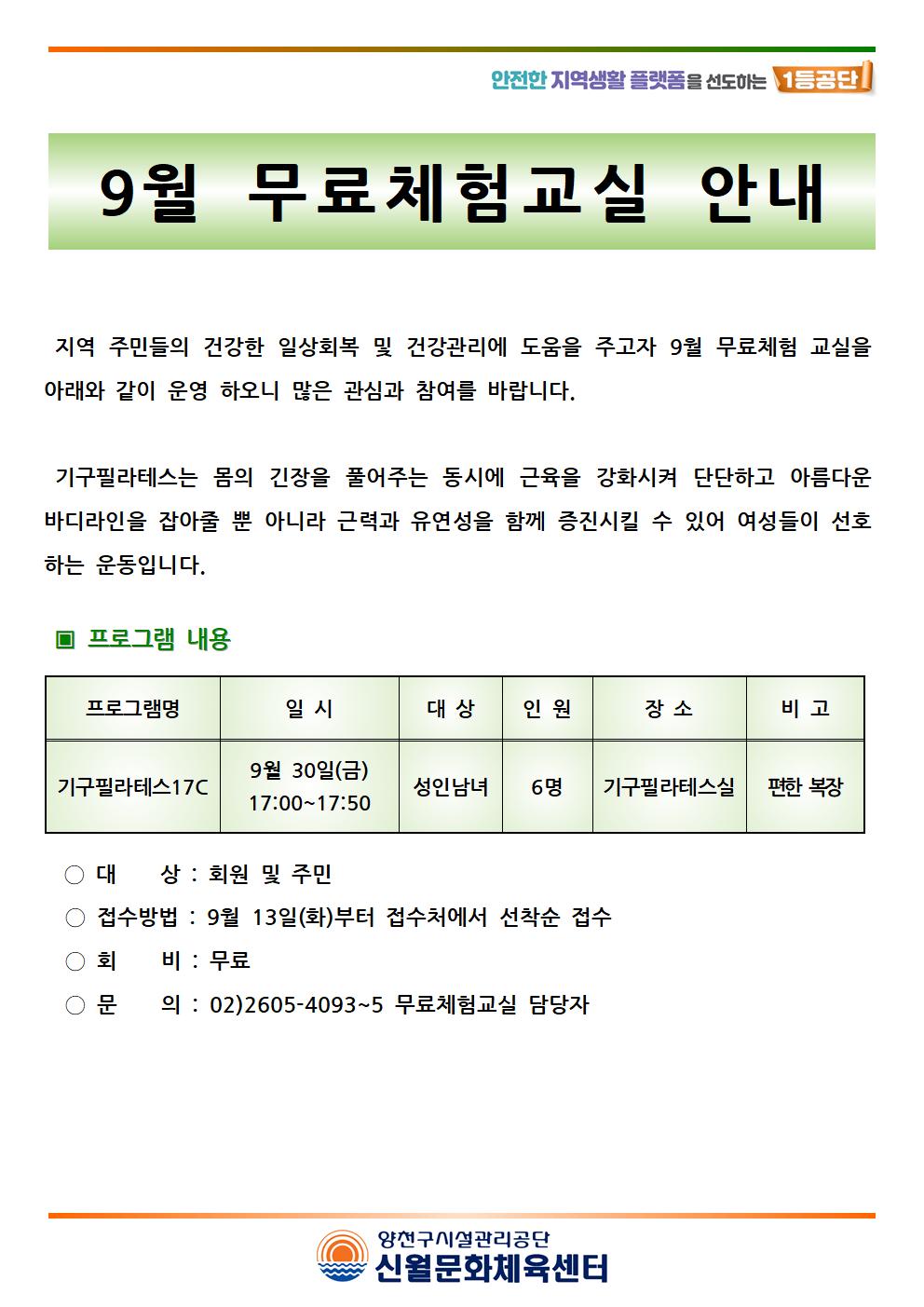 신월문화체육센터 9월 무료체험교실 운영 안내