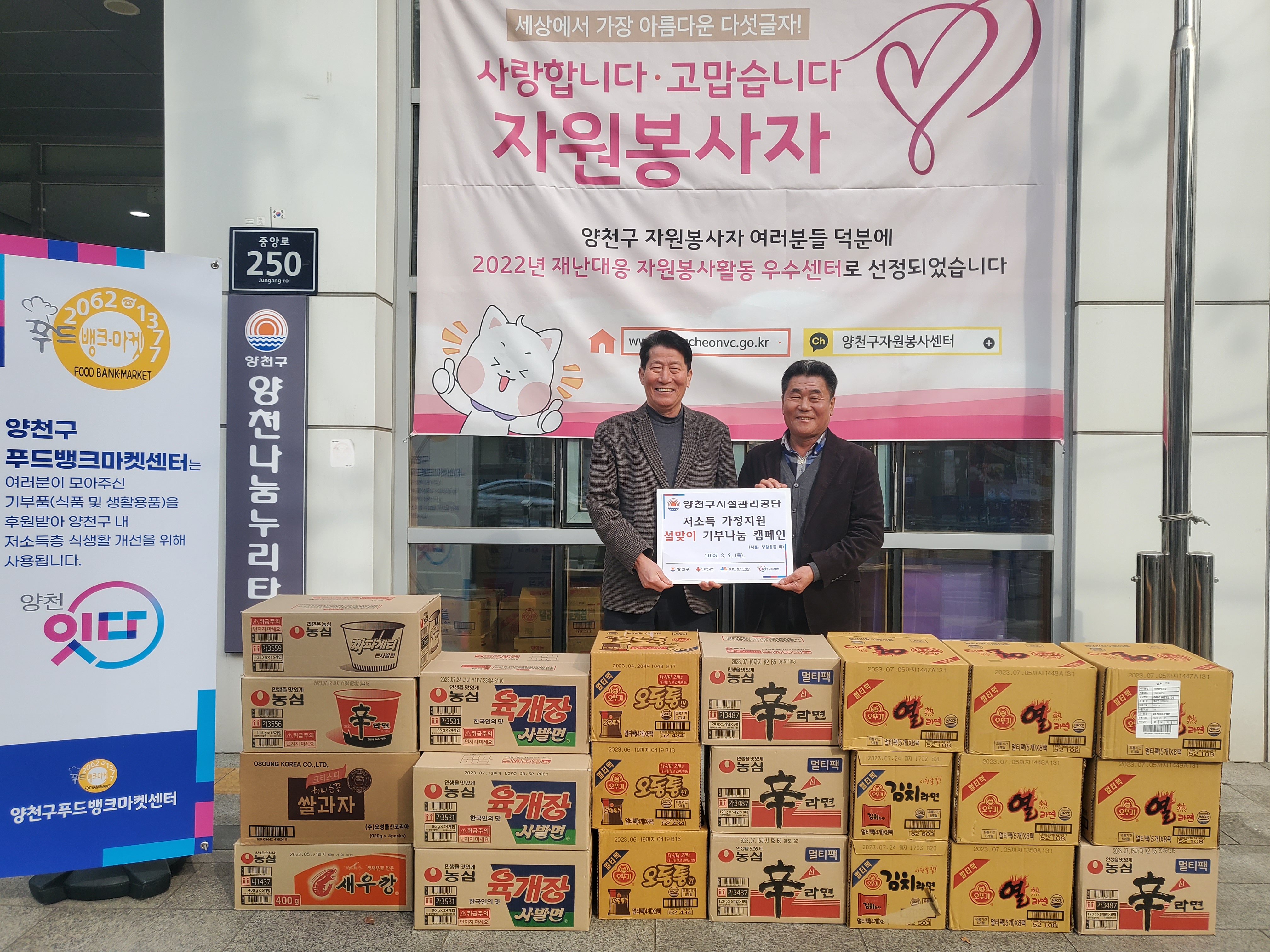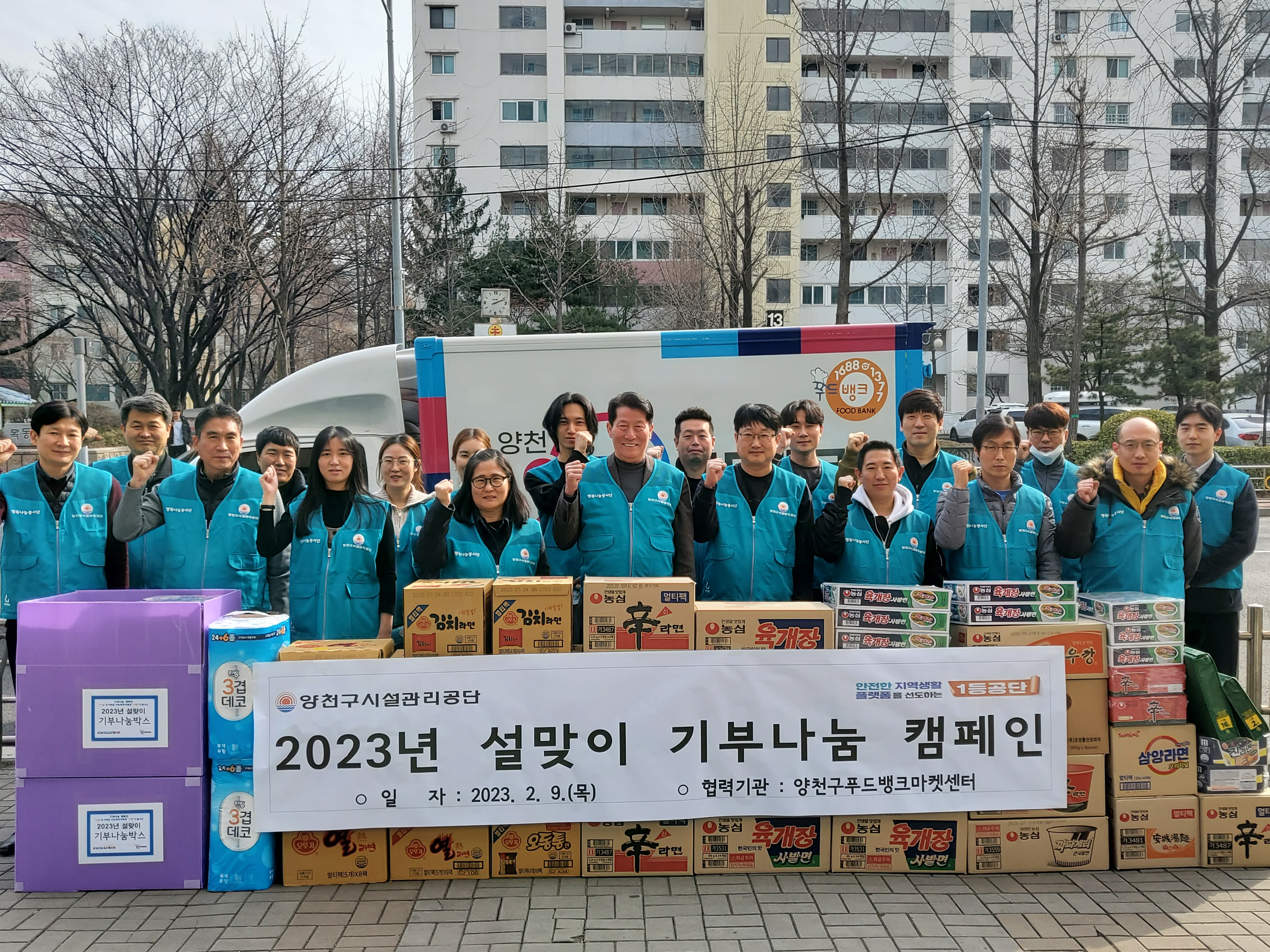 공단은 1월 16일(월)부터 3주간 부서별로 기부나눔 박스를 설치하여 기부 물품(라면, 통조림, 휴지 등 생필품) 총 1,265점(약 118만원 상당)이 모여 양천구푸드뱅크마켓센터에 기부하였다.