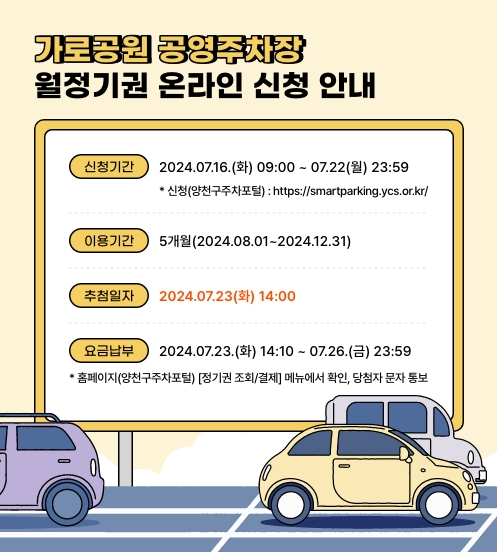 신청은 양천구주차포털(https://smartparking.ycs.or.kr)에서 7월 16일(화) 09시 정각부터 7월 22일(월) 23시 59분까지 신청이 가능하며, 추첨은 7월 23일(화) 14시에 신청 차량에 한해 전산시스템으로 자동 추첨을 실시한다.