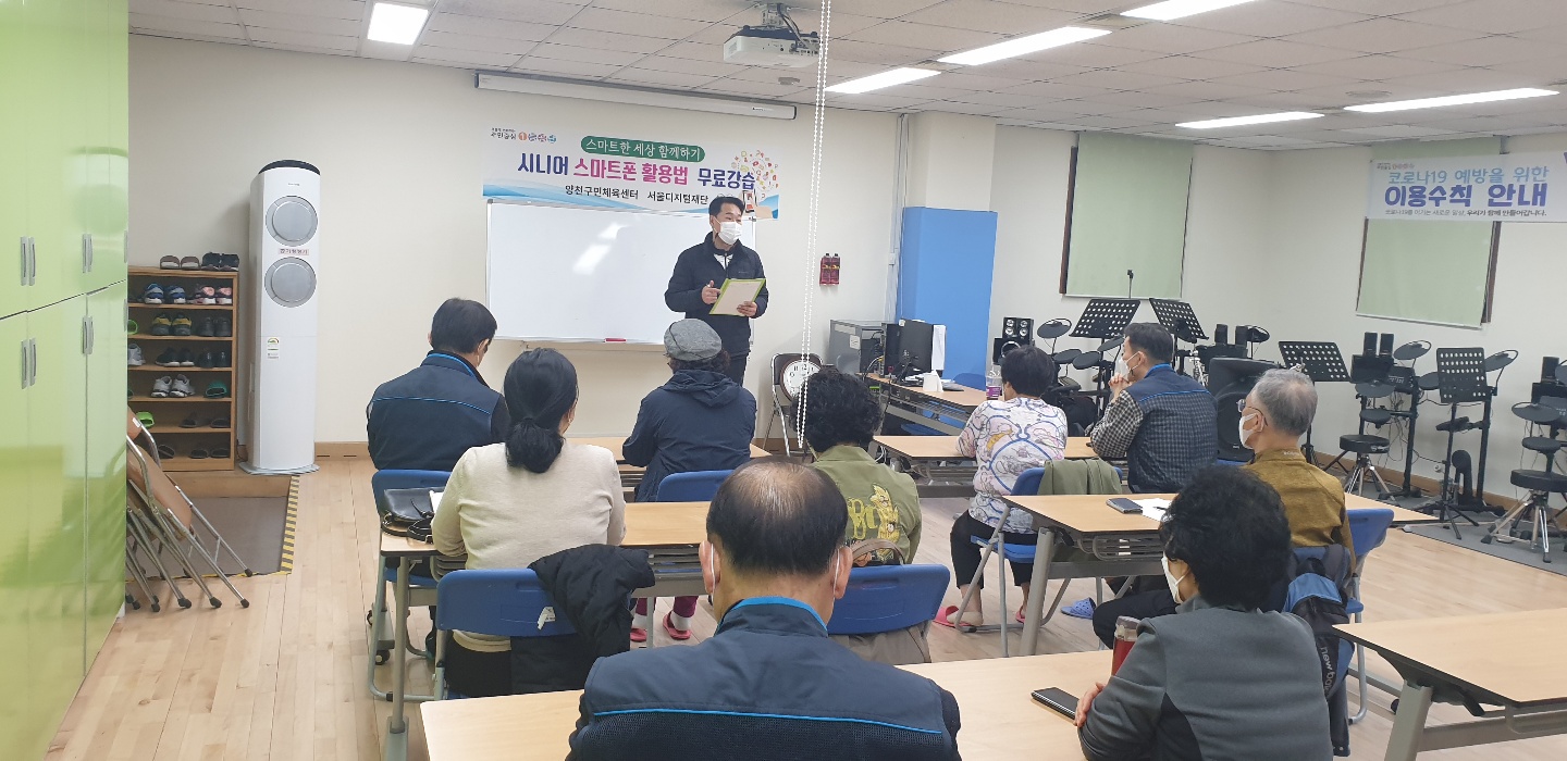 양천구시설관리공단(이사장 조주연) 양천구민체육센터는 디지털 소외계층 없는 사회 구현을 위해 실시한 「시니어 스마트폰 활용법」무료강습이 11월 26일(금)을 끝으로 종료되었다고 밝혔다. 양천센터는 2021년 상반기부터 무료강습 프로그램을 계획하였지만, 코로나19 재확산으로 인한 휴관으로 아쉽게 취소되었다. 11월 재개관 후 다시 추진하여 4회에 걸쳐 총 48명이 참여로 진행된 이번 강습은 특히 서울디지털재단의 전문 강사와 주민의 1:1 눈높이 강습, 어르신들의 높은 학구열과 참여율로 어르신들의 호응이 높았다. 양천센터 관계자는 “이번「시니어 스마트폰 활용법」무료강습을 통하여 세대 간 소통을 높이고 디지털 격차를 해소할 수 있는 기회가 제공되었기를 기대하며, 내년에도 다양한 무료강습을 준비하도록 노력하겠다.”고 전했다.