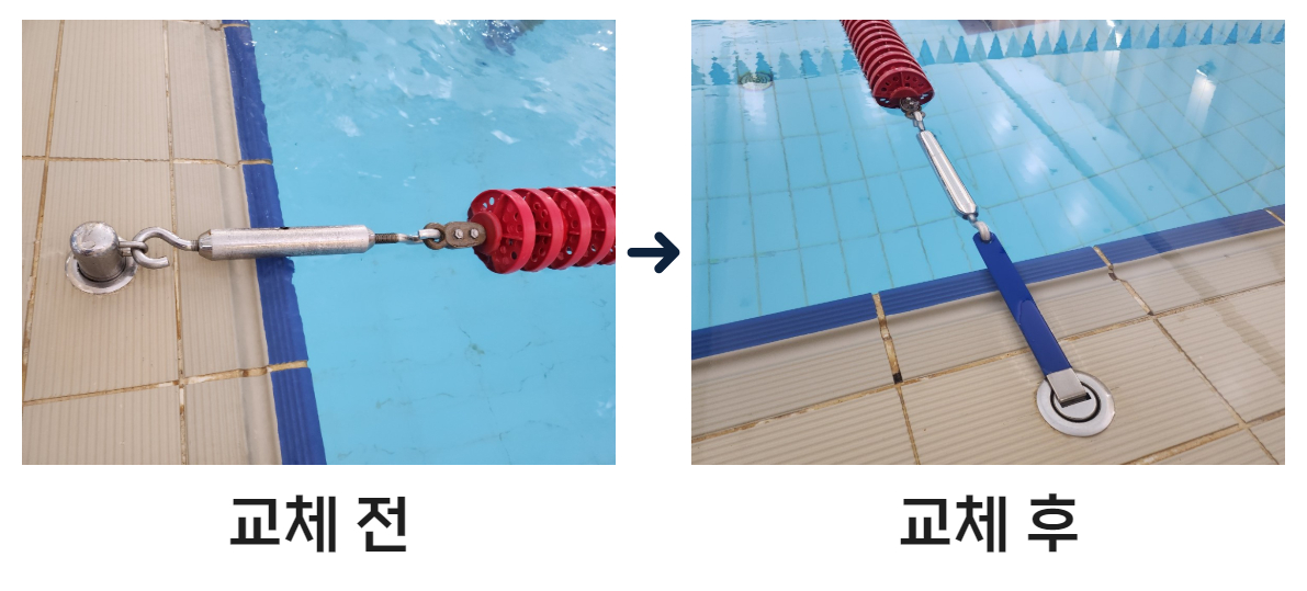 이번 개선 작업은 수영장 기존 코스로프 턴버클의 구조가 수영장 이용자들의 부딪힘 및 발가락 골절 사고를 초래할 가능성이 있어 사고 위험을 최소화하고 하고자 추진됐다.