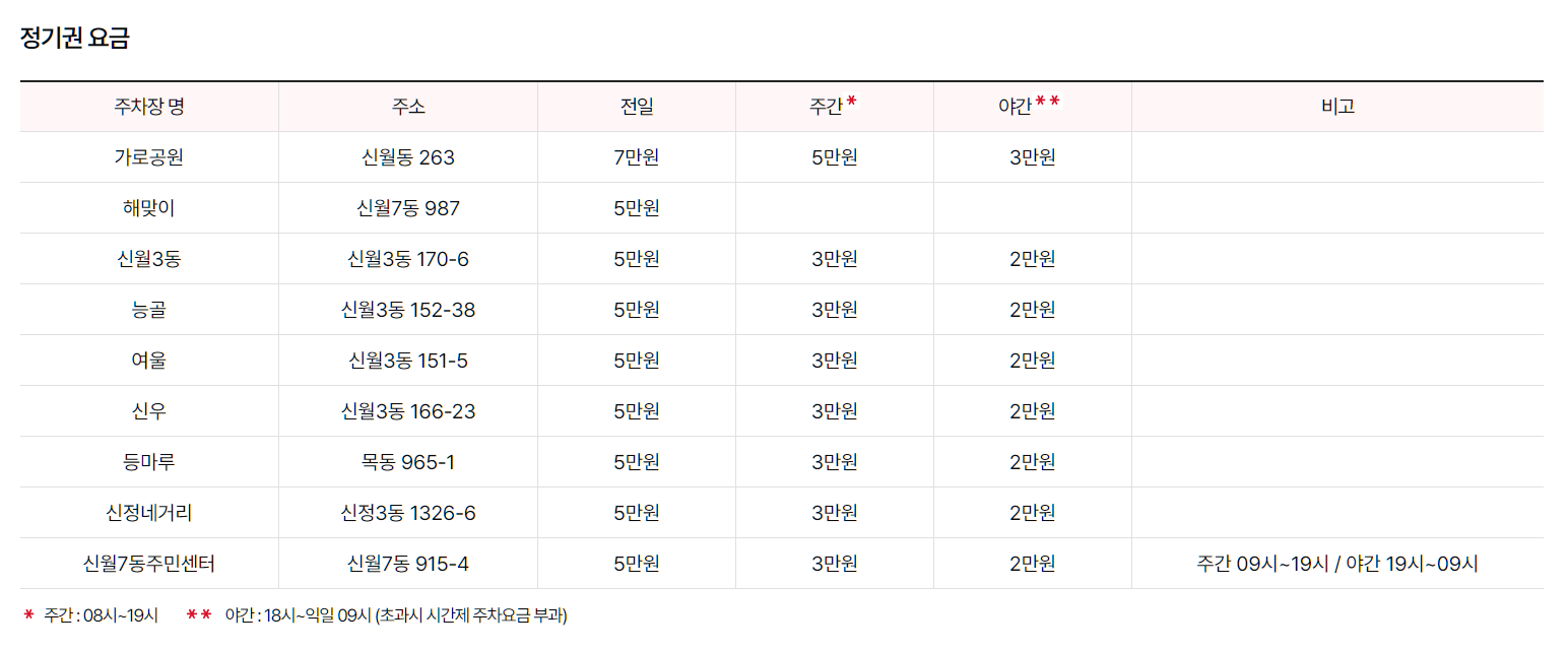 양천 통합주차포털 사이트에 주차장별로 전일,주간,야간 관련 정기권 요금이 별도 공지되어 있습니다.
